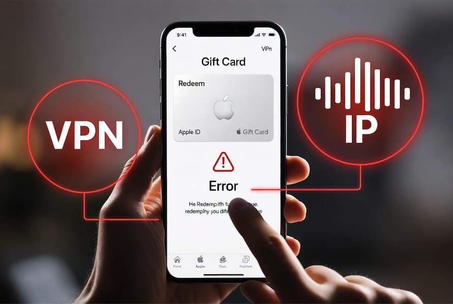 از دیگر اشتباهات رایج، ریدیم کردن گیفت کارت با استفاده از VPN فعال است. بهطور کلی، سیستم امنیتی اپل نسبت به تغییرات ناگهانی آیپی حساسیت بالایی دارد؛ بهطوریکه فعالسازی گیفت کارت با VPN میتواند باعث عدم تطابق آیپی، ریجن اپل آیدی و موقعیت مکانی شود و این رفتار بهعنوان فعالیت مشکوک شناسایی گردد. در حقیقت، در حالت عادی برای فعالسازی این کارت نیاز به استفاده از وی پی ان نیست. اما در صورتی که در کاربر در کشوری قرار دارد که App Store به طور کامل در دسترس نیست، باید آی پی VPN به دقت تنظیم شود و پس از آن ریدم کارت انجام شود.